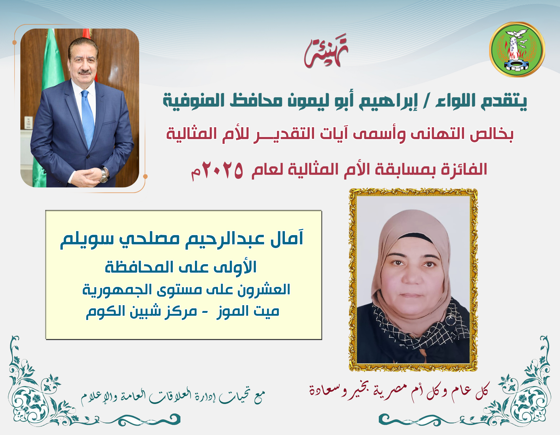 أعلن اللواء إبراهيم أبو ليمون محافظ المنوفية عن فوز السيدة / آمال عبدالرحيم مصيلحي سويلم بالمركز الأول على مستوى المحافظة والعشرين على مستوى الجمهورية "كأم مثالية " في مسابقة الأم المثالية لعام 2025 على مستوى محافظات الجمهورية ضمن مسابقة وزارة التضامن الاجتماعى، وذلك لما قدمته من تضحيات خلال رحلة عطاء مشرفة.