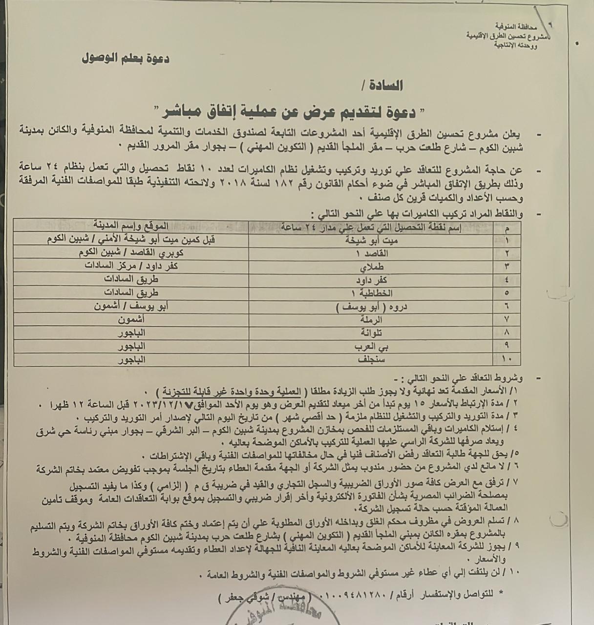 لتوريد وتركيب نظام كاميرات لعدد 10 نقاط تحصيل تابعة للمشروع تعمل بنظام 24 ساعة علماً بأن التعاقد بطريق الإتفاق المباشر فى ضوء أحكام قانون رقم 183 لسنة 2018 ولائحتة التنفيذية .